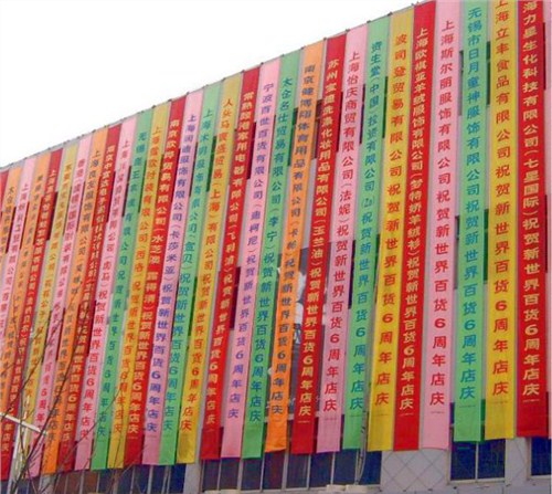 横幅是一种经常用于现代商业宣传活动中的一种,它是用横幅布做为材料,在彩色喷绘机上喷出颜色,长度和宽度可以随意调整。颜色经久耐用。制作时间一般为一到二天,特殊情况可以加急。 横幅制作工艺分为机器喷印制作和丝网制作工艺,常用规格尺寸是5米长,0.6米宽,价格一般是10元一米。量大可以优惠。